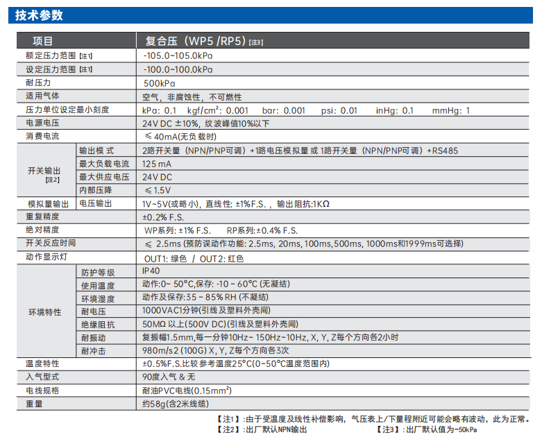 - 壓力單位可轉(zhuǎn)換: kPa、MPa、kgf/cm2、bar、psi、inHg、mmHg